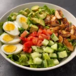 - In a bowl, toss together mixed greens, diced avocado, diced cucumber, and sliced hard-boiled eggs.