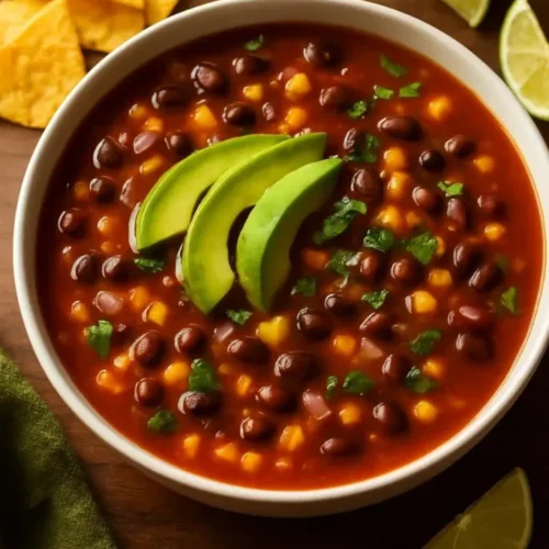 - Serve hot, garnished with tortilla strips, avocado, and lime wedges.